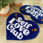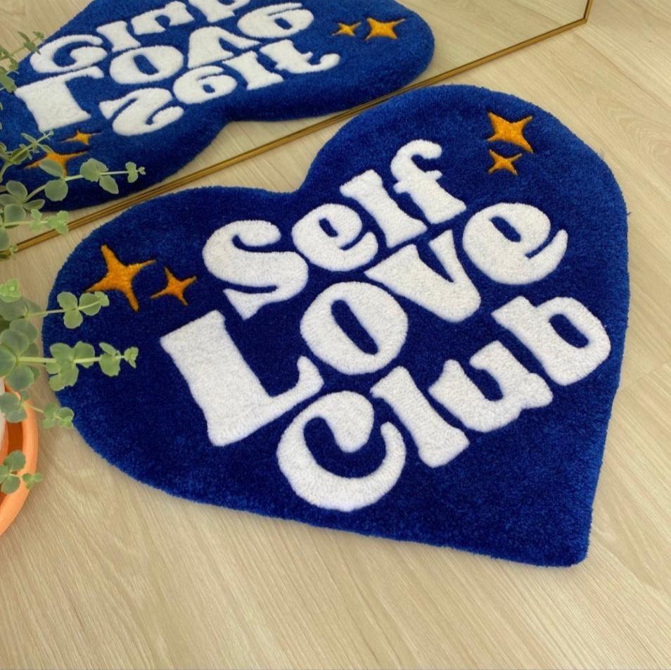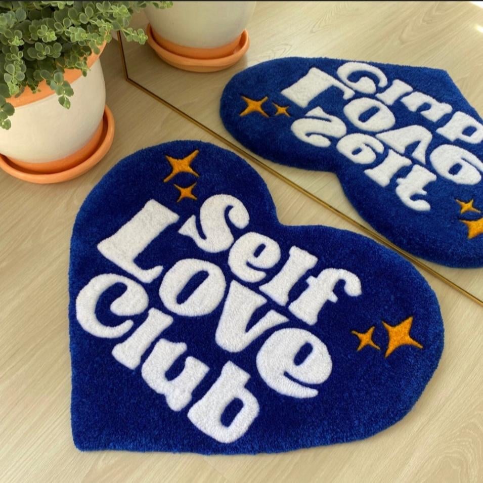 Brighten up any space with this playful Self Love Club heart-shaped rug. Featuring bold lettering and a vibrant blue backdrop with pops of gold accents, this rug brings both comfort and inspiration to your home. Whether it’s for your bedroom, living area, or creative space, this piece will remind you daily to embrace self-care and confidence.